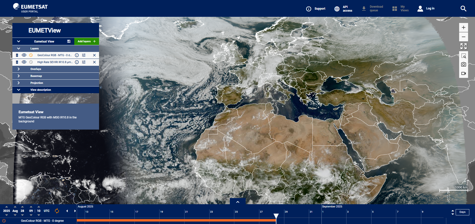 The EUMETView WebUI allows you to personalise your data viewing, and to save your settings for future use. Data can be viewed as either point-based information, and as time series. Maps, and their corresponding geo-referenced products, can be animated and downloaded.